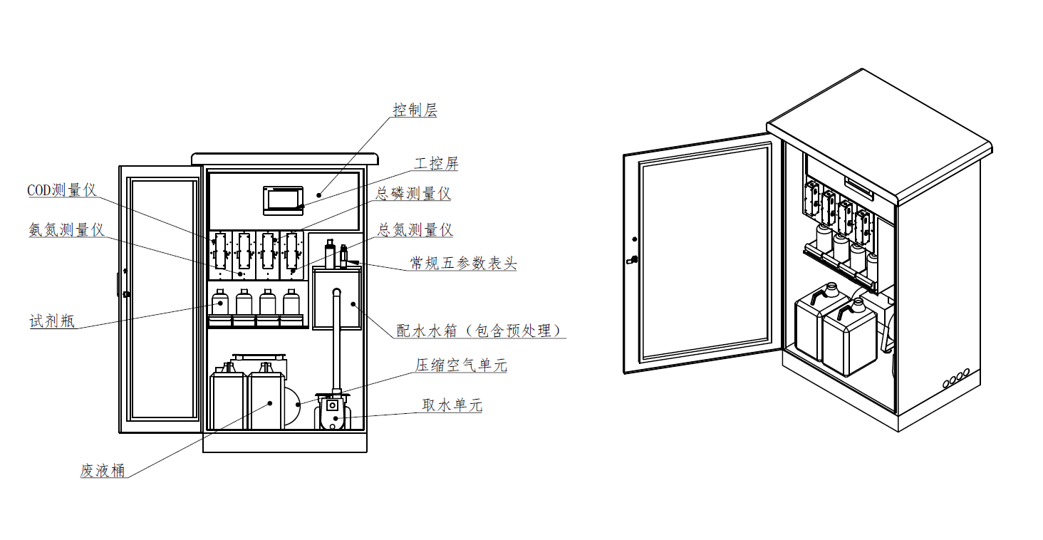 集成化設計:常規五參數和四大參數分別集成為二個測試單元,使用一個大屏顯示和控制。使系統體積大幅降低,占地面積小,便于遷移、運輸和安裝,減少了對環境的影響和人力、物力及財力的浪費。可連續監測包括水溫、pH、溶解氧、電導率、濁度、高錳酸鹽指數、氨氮、總磷、總氮等多種水質參數。